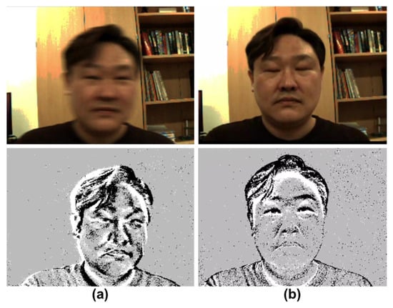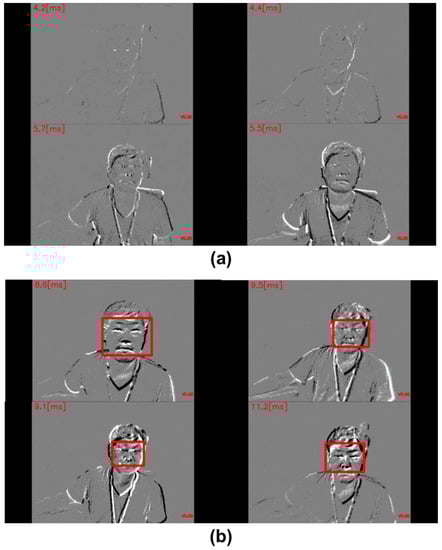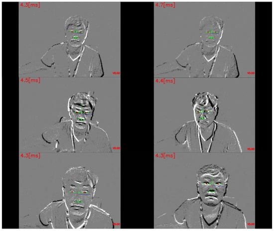 The dataset employed for our proposed method was thoughtfully constructed, consisting of real-world videos captured using the DAVIS 346 event camera. To train the eye–nose region detector, we used a combination of images from both the subtle and large motion categories of the event camera dataset. We efficiently detected eye–nose regions in the event camera images using the EBL method []. Due to the limited number of available images in the dataset, our focus was on the early and middle stages of the EBL training process, excluding the final matured stage. Specifically, the detector training incorporated 3608 event camera images along with 3949 negative non-face background images. For the eye–nose region aligner, we exclusively concentrated on the large motion category of the event camera dataset during training. The aligner’s primary task was to accurately handle eye shapes under significant motion, making the large motion DB particularly well-suited for this purpose. The event camera alignment training comprised 2273 events with verifiable eye shape.