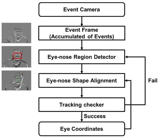 In our research, the creation of event frames is an important step. By accumulating events over a 33 ms interval, we translate this information into a visual format familiar to standard frame-based systems. The flowchart in Figure 4 starts with data from the event camera. These data are collected over the 33 ms period to form the event frame. Once the frame accumulates events for the set 33 ms interval, it is passed on to the next stage for processing. After forming the event frame, our method first identifies and localizes the eye–nose region within the frame. This detection step utilizes cascaded Adaboost classifiers with multi-block local binary patterns (LBPs) for the robust and efficient recognition of the eye region. Upon successful detection of the eye–nose region, our system activates the SDM-based eye–nose shape alignment. The next tracking checker block ensures that our tracking is maintained over consecutive frames and verifies the validity of the tracking. For the tracking checker, we utilize Scale-Invariant Feature Transform (SIFT) features extracted around 11 landmarks on bare faces and use a support vector machine (SVM) to ascertain the success of tracking. When the eye tracking fails, it restarts the detection mode, which scans the whole image to find the eye–nose area with a relatively lower speed (16 ms), compared to the tracking mode (5 ms), which utilized a small region of interest from the eye tracking success in the previous camera frame. Therefore, it is desirable to maintain the tracking mode at each frame without the execution of the detection module, in terms of the overall system latency. The above processes yield the final eye coordinates, allowing our system to effectively and efficiently track pupils in dynamic environments. The entire process, from event frame formulation to the extraction of the final eye coordinates, is illustrated in Figure 4.