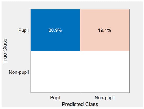 In this study, the primary objective was assessing how existing algorithms perform when applied to event camera imaging. Our approach used machine-learning-based computer vision methods, including a multi-block LBP-based detector and SDM-based aligner, to achieve real-time and efficient pupil-tracking performance. For our experiments, we aggregated events into frames at 30 fps to accurately represent eye movements. This rate was chosen for its visual clarity and its compatibility with our SDM-based keypoint alignment. Our algorithm, utilizing the SDM, showed optimal performance with data aggregated at this rate. We evaluated the algorithm’s capabilities using a comprehensive dataset that included various eye movement scenarios, and we compared the results with our previous frame-based eye-tracking algorithms. While our event camera-based approach achieved a nearly equivalent detection accuracy of 98.1%, closely matching the 99.4% achieved by traditional RGB frame camera methods [], there was a noticeable decline in the tracking accuracy. The tracking accuracy dropped from 99.4% with the RGB-frame-camera-based method [] to 80.9% in our proposed approach. To further quantify our results, we computed the precision and recall for our method. The precision achieved was 100%, and the recall was 80.89%. Based on our testing, the confusion matrix related to our approach has been detailed in Figure 6. Our true negative value was zero, consistent with our test dataset that did not contain any images without pupils. A notable point from our results is the zero false positives. This can be attributed to the intrinsic nature of event cameras, which do not output any pixel value in static backgrounds. Hence, there is no activation unless there is motion. This characteristic eliminates the chances of false positive detections in areas with no movement, showing one of the significant advantages of utilizing event cameras. Since event cameras might not consistently provide uniform shape information, SDM can sometimes fail in its regression tasks, leading to less precise tracking. Moreover, our tracker checker tends to discard tracking instances when the shape information is unclear, especially during non-insufficient movements. Our choice of the AdaBoost-based eye–nose detection combined with the SDM-based pupil alignment was intentionally selected. This conventional method was chosen driven by our primary aim: to examine the feasibility of well-established remote eye-tracking algorithms on rapidly functioning event cameras. As demonstrated in our previous research on RGB-frame-based cameras [], while advanced deep learning methods may offer improved results, our technique can operate efficiently on CPUs, eliminating the necessity for high-priced GPUs. However, methods, like AdaBoost and SDM, have limitations when confronting outliers, noise, occlusions, and other challenging scenarios compared to newer deep learning techniques. A further study focusing on deep neural networks designed for event cameras is required.