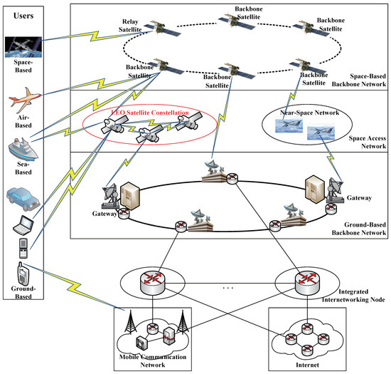Recent technological advances (including improvements in single-satellite performance and reductions in launching and manufacturing costs) make it possible to the deployment of low Earth orbit (LEO) satellite constellation systems, which can offer high-speed and huge-capacity communications between satellites and the ground, and thus STNs have attracted much attention in the sixth generation (6G) mobile communication technology. In terms of the structure of STNs, as illustrated in Figure 1, LEO satellite constellations play a crucial role. Unlike traditional geostationary Earth orbit (GEO) satellites, LEO satellites have the advantage of low latency, and mega-constellation systems of LEO satellites provide an effective way to realize global continuous coverage. Therefore, LEO satellite constellations are considered a promising solution for space backbone networks, capable of providing phone high-bandwidth, low-latency, and wide-ranging internet service access to users across the globe, and satellite internet is increasingly becoming an important information infrastructure.