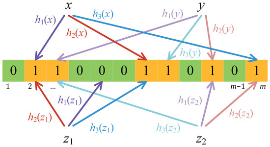The most recognized advantage of the Bloom filter is that there are no results of false negatives, i.e., the membership query results will always return positives for inserted elements. However, the Bloom filter still produces false positive results with a certain probability. Considering a query in Figure 2 for the element that has not been inserted, a false positive is returned since all the bits at positions , , and are set to ‘1’, which is caused by the insertion of other elements.