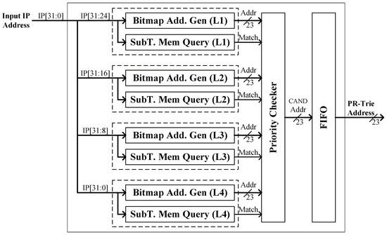 For subtrie membership queries in each level, if a subtrie corresponding to the input IP address is found, or to be more precise, the filter of this level returns a positive, the candidate PR-Trie address will be input into the priority checker module. The priority checker module inspects the candidate PR-Trie address set based on the longest prefix matching (LPM) principle, and these candidate addresses will be stored in a FIFO buffer in priority order. Once the correct PR-Trie address is accessed next (in Bitmap Lookup), the FIFO buffer is cleared at the same time.