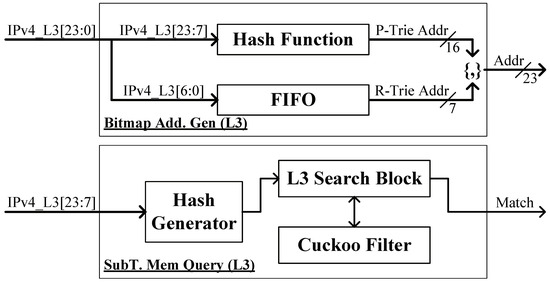 In the Level 3 submodule, the most significant 17 bits of the input (i.e., IPv4_L3 [23:7]) are used to calculate the P-Trie bitmap address in the Bitmap Address Generator and perform the membership query in the Subtrie Membership Query. The least significant 7 bits of the input (i.e., IPv4_L3 [6:0]) used as the R-Trie address indexing the R-Trie bitmap are stored in a FIFO buffer until the P-Trie address hashing procedure is completed, then concatenate the above two addresses to generate a candidate PR-Trie address.