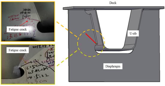 Cyclic vehicle loads result in the deflection of U-ribs in OSDs, which causes the out-of-plane deformation of the diaphragm. Consequential stress concentration occurs at the diaphragm-to-rib weld, and fatigue cracking propagates obliquely upward form the bottom of the weld between the diaphragm and the U-rib on the real steel bridges, as shown in Figure 1.