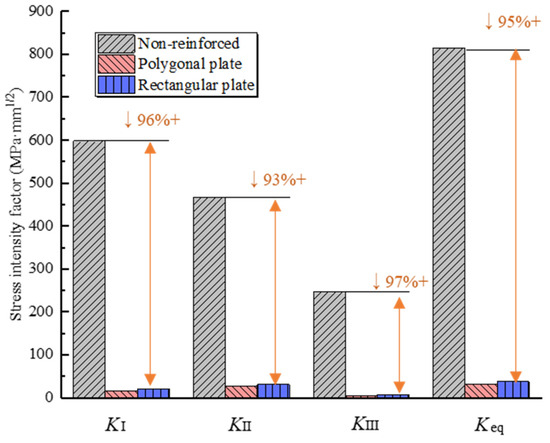 The stress intensity factors obtained via the finite element method are shown in Figure 4. It was seen that the stress concentration at the crack tip was obvious before reinforcement. After the steel plate reinforcement, the stress concentration was reduced, and the stress intensity factors fell by more than 93%. Keq before the reinforcement reached 813.68 MPa·mm1/2, which decreased to 31.75 and 37.70 MPa·mm1/2 respectively after being reinforced with polygonal plate and rectangular plate. The values of the stress intensity factors after polygonal plate reinforcement were slightly higher than those after rectangular plate reinforcement. The results indicated that, both polygonal plate reinforcement and rectangular plate reinforcement had a significant effect on hindering crack propagation. In addition, before reinforcement, the crack that grew obliquely from the diaphragm-to-rib weld was shown as a mixed mode crack.
