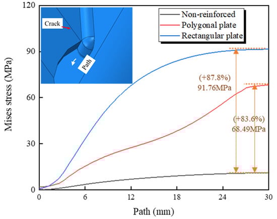 As depicted, after reinforcement, an obvious increase in stress at the arc notch on the reinforced side occurred. Compared with the non-reinforced model, the maximum stress along the path was 68.49 MPa and 91.76 MPa respectively, for the polygonal steel plate and rectangular steel plate, which are increases of more than six times. The stress at the arc notch increased in a parabolic manner when using the rectangular steel plate. Both the polygonal steel plate and the rectangular steel plate caused an increase in stress at the arc notch on the reinforced side. As the crack top bore the majority of the load before reinforcement, the crack continued to propagate under the external force. After reinforcement, the steel plate bore part of the load and the rest was distributed to the arc notch causing a stress concentration at this location. The arc notch was also a typical fatigue detail in OSDs. Compared to the rectangular plate, the stress increase caused by the polygonal plate was smaller.