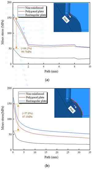 Steel plates took part in bearing loads with the component, while the local stiffness of the structure changed. Stresses at the arc notch on the reinforced side were extracted. The stress path and calculations are shown in Figure 5.