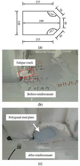 Based on the numerical simulations above, a polygonal steel plate with a thickness of 8 mm was used in the field maintenance and the maintenance was conducted on a real bridge; the plane size is given in Figure 7a. The material of the polygonal steel plate was Q345qD steel, which is the same as that of the real bridge.