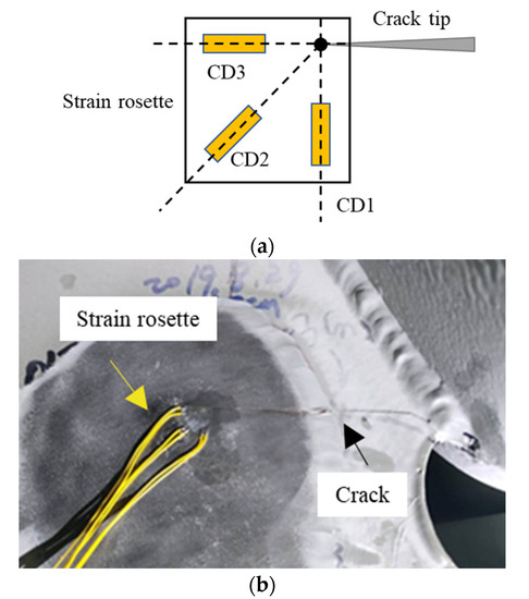 Based on the strain data obtained with a strain rosette, the maximum principal stress at the crack tip were calculated using Equation (2).