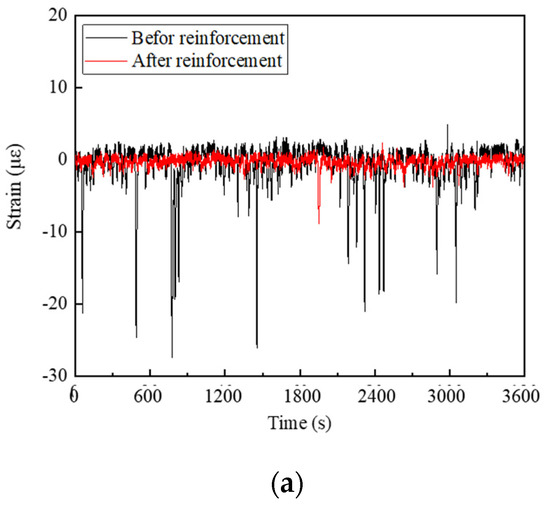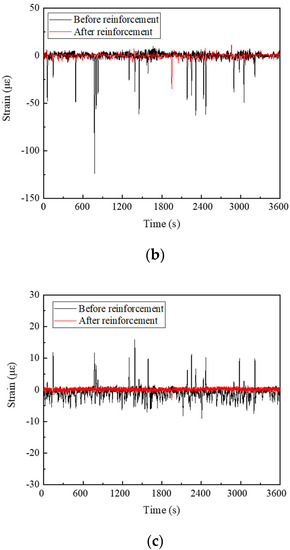 Figure 9 plots the strain records. Before reinforcement, the strain values of CD1 mainly ranged from −125 με to 9 με, and the strain values of CD2 mainly ranged from −6 με to 17 με, while the strain values of CD3 ranged from −27 με to 9 με. As shown, the measuring point area was under tension-compression cyclic loading, which was the main reason for fatigue crack growth.