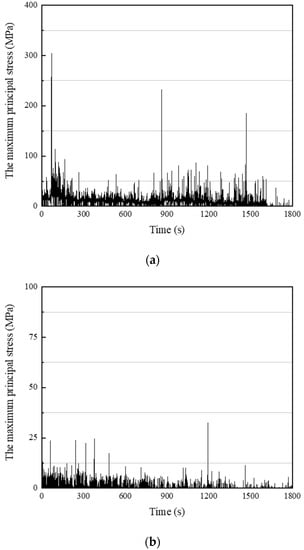 Strain data within 30 min were processed and the results are given in Figure 10. Since negative principal stress indicates compression at the crack tip, the data with negative principal stress were excluded. As shown in Figure 10, the values of decreased. at the crack tip was significantly reduced after maintenance, and the maximum recorded before reinforcement was 301.12 MPa. This decreased to 32.55 MPa after reinforcement, which was a decline of 89.4%. The stress concentration at the crack tip was improved with the steel plate reinforcement, fatigue performance was enhanced, and the fatigue life was prolonged.