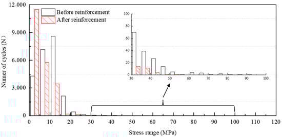 To achieve the stress range spectrum, the rain-flow counting method was adopted to handle the random stress time-history [23]. The data collected with a strain rosette before and after the reinforcement were processed and the final result is presented in Figure 11.