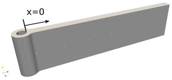 The sample used here consists of a bar with a total length l of mm, a width w of mm and a thickness of mm. The thickness of mm was chosen to match the diameter of the heating cartridge (mm). As the heating cartridge requires an absorbing wall thickness of mm, the heated end of the bar was shaped in the form of a cylinder of mm in diameter.