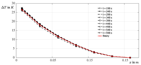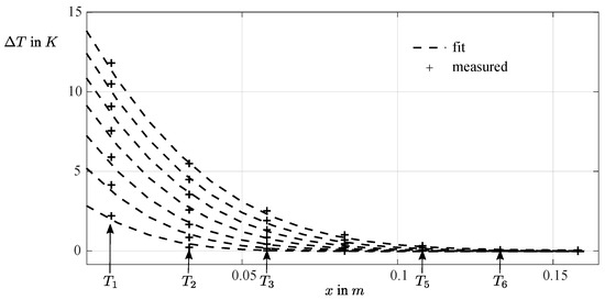At small physical times, when the Fourier-Number is significantly smaller than 1, the temperature rise at the adiabatic end is almost zero. This requires the integral in Equation (4) to vanish. The measured temperature profile can then be compared to the analytical temperature profile to determine the factor .