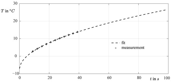 The temperature rise measured at the origin is shown in Figure 5. By fitting the constants, it can be clearly seen that the measurements correspond to the analytical curve as described by Equation (5). In this case, the fit leads to a value of kg m/Ks. This value differs from the literature value (kg m/Ks) [12] due to the uncertainty of the fit that depends critically on the exact start of the heating time. Knowledge of the specific heat flux allows determining the product . Even if the density is known, it is necessary to measure the specific heat capacity before the conductivity can be computed.