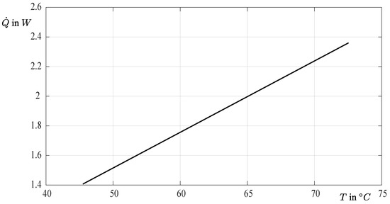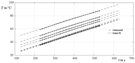 The heat loss to the ambient is shown in Figure 8. Compared to the heating power of W this accounts for an error of roughly . This error transfers to the computation of the heat capacity since the temperature slope would be steeper if the heat losses do not occur. The error can be compensated by correcting the electric power as suggested in Equation (19).