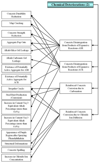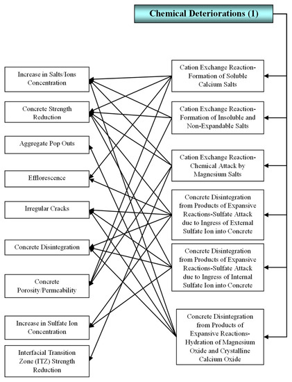 In this study, the chemical deteriorations observed in reinforced concrete structures are categorized into two main groups based on their underlying mechanisms. The first group involves deteriorations caused by a cation exchange reaction. In this type of deterioration, ions from aggressive materials replace ions present in the concrete compounds, resulting in chemical changes and subsequent degradation of the concrete structure. The second group comprises deteriorations caused by the expansion of materials resulting from various chemical reactions. These reactions induce dimensional changes in the materials, exerting pressure on the surrounding concrete and leading to cracking, spalling, and other forms of structural damage. Understanding and identifying these different types of chemical deteriorations is crucial for developing effective maintenance and repair strategies to mitigate their impact and extend the service life of reinforced concrete structures. Addressing these deteriorations at an early stage is essential to ensure the structural integrity and durability of the concrete components.