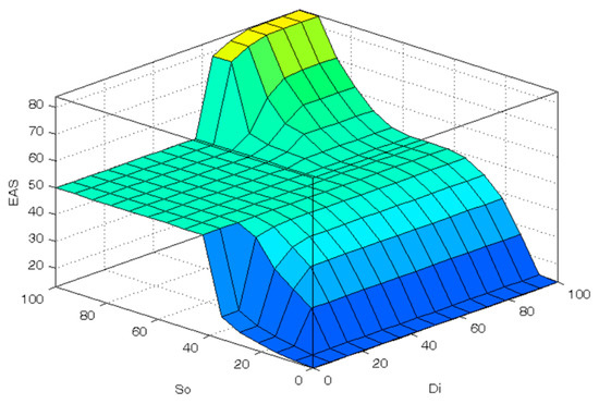 Every fuzzy function has an output that has a specific level according to its membership function. These levels are summarized by logical “and” operator, which takes the minimum value into account.