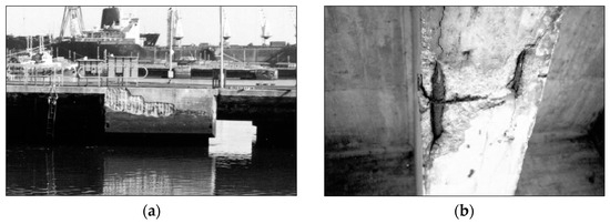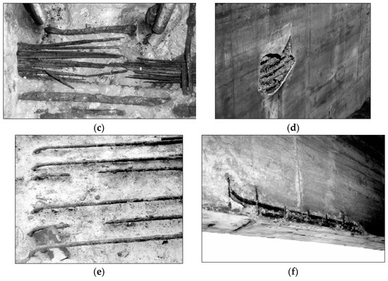 (a) Typical deterioration observed for a bridge in Sado River, Portugal in the splash and tidal zones; (b) concrete spalling in a construction joint; (c) corrosion of prestressing steel in un-grouted ducts; (d) macro-corrosion cell in dock walls; (e) bars with 25 mm diameter totally corroded; (f) concrete spalling in a low cover zone [35].