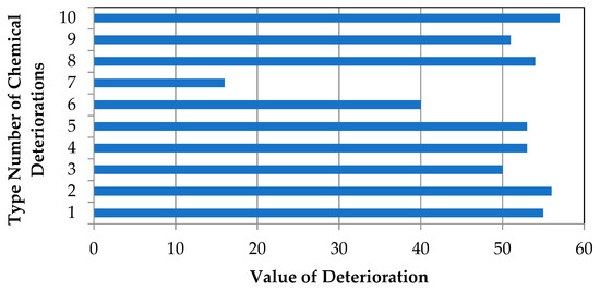 Costa and Appleton [35] pointed out the deterioration symptoms of a bridge at the Sado River coastal pier in Portugal (Figure 10). In this research, the observations of the mentioned bridge deterioration symptoms [35] have been investigated to validate the developed fuzzy expert system. Table 3 indicates the values of each symptom of chemical deterioration in a bridge at the Sado River coastal pier in Portugal. According to Table 3, the most severe chemical deterioration symptoms are “steel rust production (corrosion)” and “increase in chloride ion concentration.” Also, according to Table 4 and Figure 11, the results of developed fuzzy expert system diagnose the deterioration type of “reinforced concrete corrosion due to chloride ion diffusion” as the most severe deterioration type.