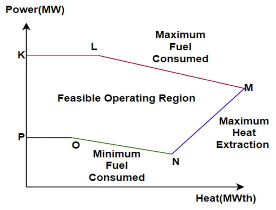Thermal generating units, cogeneration units, and heat-only units were taken into consideration for the problem formulation of the CHPED. The heat-power viable operation zone of a combined cycle cogeneration unit is depicted in Figure 1. The KLMNOP boundary curve encloses the viable operation zone.