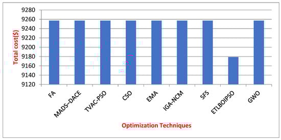 Figure 2 shows the total costs obtained by different optimization techniques for the load and heat demand of 200 MW and 115 MWth, respectively; out of all the techniques, it is shown that ETLBOIPSO [] gave the best results (total cost = $9178.9934), whereas the other techniques gave almost the same results.