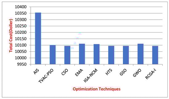 Figure 3 shows the total costs obtained by different optimization techniques for a load demand of 600 MW and a heat demand of 150 MWth. Out of all the techniques, CSO [] gave the best results, whereas AIS [] gave the worst results for this case study.