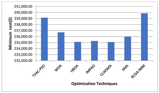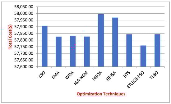 Figure 4 shows the total costs obtained by different optimization techniques for a load and heat demand of 2350 MW and 1250 MWth, respectively. In this case, ETLBOI-PSO [] gave the best results, whereas HBOA [] gave the worst results.