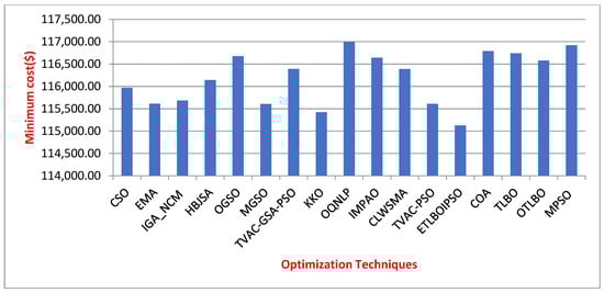 Figure 5 shows the total costs obtained by different optimization techniques for a load and heat demand of 4700 MW and 2500 MWth, respectively. In this case, ETLBOI-PSO [] gave the best results, whereas OQNLP [] gave the worst results.