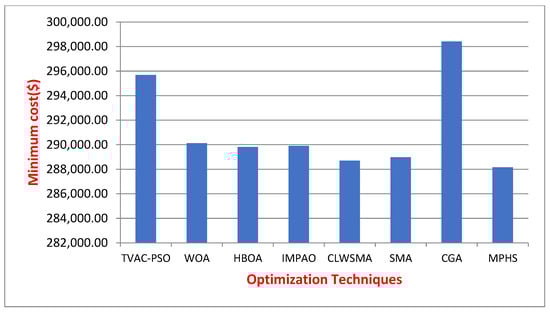 Figure 6 shows the total costs obtained by the different optimization techniques for a load and heat demand of 12,700 MW and 5000 MWth, respectively. In this case, CLWSMA [] gave the best results, whereas CODED GENETIC ALGORITHM [] gave the worst results.