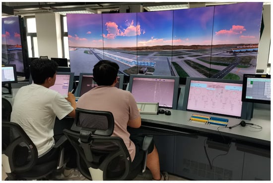 In this study, a tower air traffic control simulator was used to provide an air traffic control environment to collect data. The simulator provided a virtual take-off, landing, and taxi scenario of an airport. The simulator and the layout of the simulated airport are shown in Figure 1 and Figure 2, respectively. In the simulator, nine network computers were used to simulate the control system, approach radar, airport surveillance radar, and scenarios. Two radio communication devices were used to provide communication between the controller and pilot. The airport scenario was shown on five large displayers, providing a 120° field of view. Flights were simulated in the control system during the experiment. The ATCOs provided instructions to the virtual pilots through the radio according to the radar and airport view and the virtual pilots executed the instructions to operate all the virtual planes. The simulator has been used in ATCO training and license assessment for many years, which was helpful to make the ATCOs immerse in the simulated environment of air traffic control under a similar psychological state to their actual work.