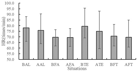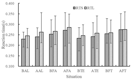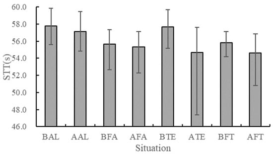 According to the experiment design, the eight situations can be considered as eight different states of the participants under the effects of various factors. One-way ANOVA with repeated measures was used to analyze the effects of the eight situations and the four states on the physical characteristics and abilities of the ATCOs. Post hoc pairwise tests were used to assess the effects of each key factor under certain conditions. In the analysis of the eight situations, the following pairwise comparisons were made: BAL vs. AAL to check the influence of the simple task; BAL vs. BFA to determine the effects of the initial fatigue state; BAL vs. AFA to assess the effects of the fatigue state during work; BAL vs. ATE to evaluate the effects of the tension state; BFA vs. AFA to determine the effects of the simple task at the basis of the initial fatigue state; AFT vs. AFA and AFT vs. ATE to evaluate the effects of tension and fatigue, respectively, when they occurred together; and AFT vs. BAL to assess the combined effects of fatigue and tension. In the analysis of the four states, the following pairwise comparisons were made: AL vs. FA, AL vs. TE, and AL vs. FT to evaluate the effects of fatigue, tension, and their combination, respectively, and FT vs. FA and FT vs. TE to assess the effects of fatigue and tension.