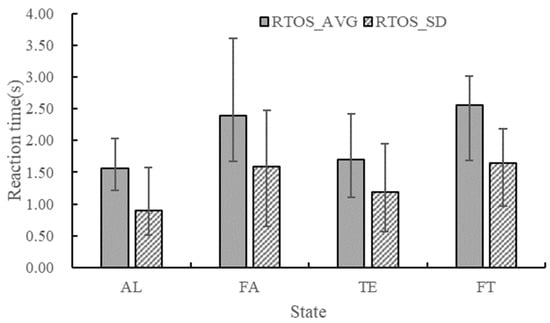 The effects of fatigue are a continuum with different degrees [13]. It is supposed that higher levels of fatigue are associated with severer effects and contribute to assessing the effects of fatigue more clearly. The subjective fatigue levels and the analysis results (comparison between BAL and AAL) showed that no obvious post-work fatigue was induced by the simple task. It is believed that the key component of fatigue in the AFA situation was the drive to sleep. Among the eight situations, the subjective fatigues level in the AFA situation were the highest. Therefore, the AFA was used to analyze the effects of the fatigue state during work in depth. The ATE was selected to represent the tension state during work. According to the results of the pairwise comparison of BAL vs. AFA and AL vs. FA (Table 3), ten indicators were selected for investigating the effects of fatigue: HR, STT, RTL, RTS, ROA, TDSA, ART, DHR_AVG, RTOS_AVG, and RTOS_SD. According to the results of the pairwise comparison of BAL vs. ATE and AL vs. TE, five parameters were selected to analyze the effects of tension: STT, ART, DHR_AVG, DHR_SD, and RTOS_SD. The objective was to determine the decreasing order of these indicators that were affected by fatigue and tension, respectively, to discuss their influence mechanisms. We used repeated measures and a paired t-test was used to estimate the levels of the effects. Comparisons of the BSO and AFA situations and the SO and FA states were performed for fatigue and comparisons of the BSO and ATE situations and the SO and TE states were conducted for tension. A higher Cohen’s d obtained from the analysis means a bigger effect size. The results of the indicators are shown in Table 4, indicating that the indicators affected by fatigue in decreasing order were HR, RTOS_AVG, STT, RTOS_SD, DHR_AVG, RTL, ROA, RTS, ART, and TDSA, and the indicators affected by tension were DHR_AVG, STT, DHR_SD, RTOS_SD, and ART.