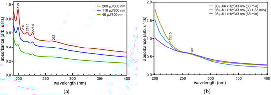 UV-vis absorption spectra of the produced solutions corresponding to the 800 (a) and 343 nm (b) ablation.