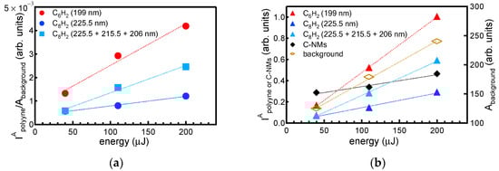In addition to the peaks from the polyynes and the band from C-NMs in the low wavelength region, the spectra are also characterized by a background absorption in the whole spectral region up to the longest measured wavelength of 1100 nm. This background absorption is attributed to the formation of various residual hydrocarbons (impurities) that have a form that is different than that of the polyynes, and it typically appears during polyyne synthesis by laser ablation of graphite in water using ns or ps laser sources [5,7,12]. In connection with these studies, the ratio of the integrated intensity of the absorption peak from the polynes to that of the background (IApolyyne/Abackground) is a measure of the efficiency of polyyne formation over the other products upon laser ablation of the bulk target in liquid [5,27]. The ratio determined for the two polyynes versus the pulse energy is plotted in Figure 2a. The integrated intensity of the polyyne peaks, C-NMs band (IApolyyne or C-NMs), and residual background absorption (Abackground), which are proportional to the relative concentration of each of those species in the solution, are also plotted in Figure 2b.