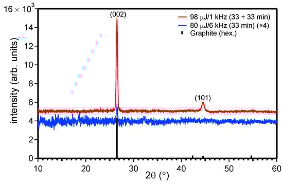 The crystal structure of the formed C-NMs is the same as that of the bulk graphite target, as proven by the XRD patterns of Figure 3. Particularly, they correspond to graphite with a hexagonal crystal structure (Space group: P63/mmc) [28].