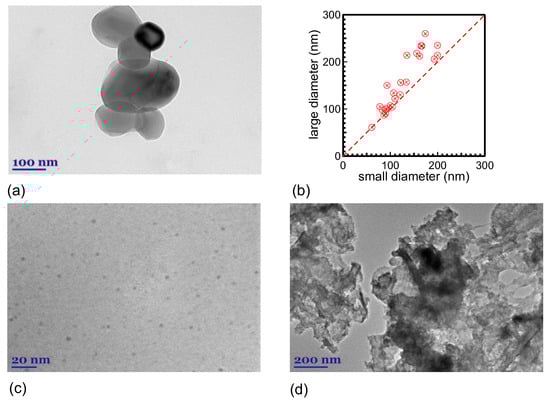 TEM images of the ablation products ((a) 98 μJ/1 kHz, 33 + 33 min; (c) and (d) 80 μJ/6 kHz, 33 min). The plot in (b) shows the large versus the small diameter of NPs in (a) (measured from the TEM images).