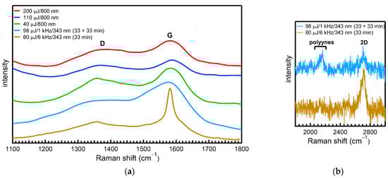 Raman spectra of the ablation products after drying the produced solutions on a substrate; spectra are in the region of 1100–1800 cm−1, where the D and G bands appear (a), and in the region of 1800–3000 cm−1, where the polyyne peaks appear at around 2100 cm−1 (b).