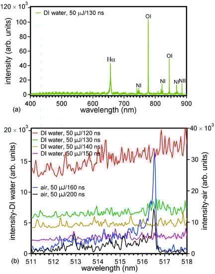 Other lines that are distinguished in the spectra measured in DI water (Figure 6a) are: Hα (656.26 nm), NI (742.46 nm), NI (744.32 nm), NI (746.96 nm), OI (777.41 nm), OI (795.08 nm), NI (818.79 nm), NI (821.71 nm), NI (824.4 nm), OI (844.73 nm), NI (863.06 nm), NI (871.95 nm), and NII (881.93 nm) [21]. The oxygen and hydrogen lines mainly originate from the water decomposition, whereas the nitrogen lines originate from the atmospheric nitrogen that exists dissolved in water.