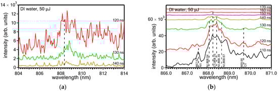 Other carbon-related lines that are distinguished in the spectra are a line at 808.37 nm (Figure 7a) that corresponds to the 2s22p3p 3P2 ← 2s22p5s 3Po1 transition of neutral carbon atoms (CI or C) [21] and a line at 868.25 nm (Figure 7b) that corresponds to the 2s24s 2S1/2 ← 2p3 2Po3/2 transition of CII ions (the weak line at 869.66 nm that is distinguished in the spectra corresponding to 110, 120, and 130 ns corresponds to the 2s24s 2S1/2 ← 2p3 2Po1/2 transition of the CII ions) [21]. Notably, the peaks that appear on either side of the peak at 868.25 nm in the spectrum corresponding to 110 ns (at 867.52, 868.04, 868.39, and 868.67 nm) (Figure 7b) are due to nitrogen ions or neutrals [21]. These lines decrease in intensity for longer time delays and are finally extinguished from the spectra at ~160 ns. The almost absent C2 Swan band from the spectra measured in DI water may be due to the possibility that so much oxygen is produced by the water decomposition at the plume–liquid interface that its reaction with the carbon plume species largely inhibits the formation of C2 dimers [C2 + O → CO + C].