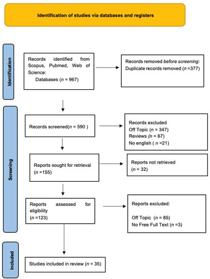 Keyword searches of the Web of Science (264), Scopus (355), and PubMed (362) databases yielded a total of 981 articles. The subsequent elimination of duplicates (391) resulted in the inclusion of 590 articles. Of these 590 studies, 555 were excluded because they deviated from the previously defined inclusion criteria. The screening phase ended with the selection of 35 publications for this work (Figure 1). The results of each study are reported in Table 2.