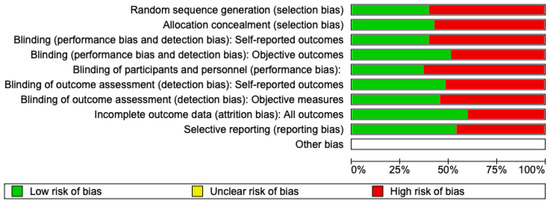 The risk of bias in the included studies is reported in Figure 2. Regarding the randomization process, 50% of studies present a high risk of bias and allocation concealment. All other studies ensure a low risk of bias. In total, 75% of studies exclude a performance; half of the studies confirm an increased risk of detection bias (self-reported outcome), and 75% of the included studies present a low detection bias (objective measures) (Figure 2). A total of 75% of studies ensure a low risk regarding attrition and reporting bias.