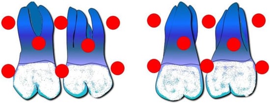 A study by Beren Zsoy and colleagues was launched in 2023 to examine the impact of LLLT on tooth mobility during orthodontic treatment maxillary molar distalization in a 12-week period. A total of 16 different points on the first and second molars have had laser therapy applied for 10 s at a time to an arbitrary molar area (Figure 5). When compared to the contralateral control group, the amount of movement of the subjects’ teeth on the applied side by the laser was much greater. In comparison to moles on the other side, those treated with the laser grew 1.22 times more in 12 weeks [30].