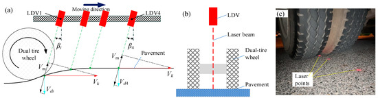 The principle of the laser high-speed deflectometer using LDV to measure pavement deflection velocity is briefly described below. The self-weight of the deflectometer will cause the road surface to form a deflection basin in an extensive range. When the deflectometer is in motion, the deflection basin also moves. It brings trouble to traditional contact measurement. As a typical non-contact measurement tool, LDVs non-destructively measure the deformation velocity of different points in the deflection basin and then calculate the deflection value of the road surface [18]. Figure 1a shows the synthesis principle of the LDV measurement Vm. The expressions among velocity Vm, vehicle speed Vk, and pavement deformation velocity Vd are shown in Equation (2). Based on the measurement principle of LDV, Vm is the velocity of the road surface relative to the sensor itself along the direction of the laser beam. That is to say, Vm is the coupling of the component Vk·sin(β) and Vd. In the subsequent calculation based on Vd, component Vk·sin(β) must be removed from Vm.
