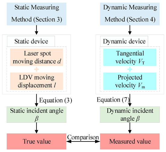 In the following, we will use static and dynamic methods to realize the angle measurement of LDV based on experiments. Considering that the mass of the laser high-speed deflectometer is large (the total weight is more than 10 t), which makes it difficult to move in the vertical direction with high precision, we removed one LDV (Model: Polytec OFV 505/5000) and carried out experiments indoors. The static measuring method draws on the research work of Ma et al. [30]. Furthermore, since this method is traceable, we take its measurement as the true value. For the dynamic measuring method, it is a new method proposed in this paper based on the measurement principle of LDV. The work of the two measuring methods will be described in detail in Section 3 and Section 4, respectively. The key processes of static and dynamic measurement methods and their connections are shown in Figure 2.