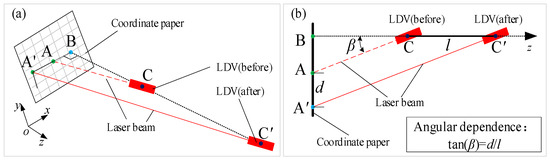 The basic principle of the traditional measuring method for a laser beam angle is shown in Figure 3. A right-handed coordinate system o-xyz is established in space. The laser beam is irradiated on a piece of coordinate paper in the oxy plane with an incident angle β of about 2°. Since angle β ≠ 0, the laser spot on the coordinate paper changes with the distance between the coordinate paper and the LDV, such as moving from point A to point A′. Assuming that the moving distance of the LDV along the z-axis is l, and the moving distance of the laser spot in the oxy plane is d, then the angle β can be accurately calculated according to the geometric relationship of the triangle, see Equation (3).