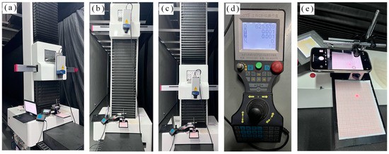 On the one hand, the actual displacement l of the LDV moving along the z-axis is calculated according to Equation (4). Parameters z1 and z2 represent the corresponding coordinates of the LDV at positions C and C′, respectively. They are provided to the digital display handle by the steel tape raster gauge (position accuracy: 0.001 mm) installed on the side of the marble platform, as shown in Figure 4d.