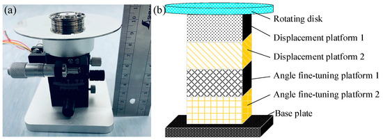 The dynamic measuring device of the LDV laser beam incident angle is shown in Figure 7. The main difference from the angular static measuring device is that the coordinate paper is replaced by a rotating disk system. This rotating disk system is controlled by a bi-directional high-precision displacement platform and can move in the x and y directions. In addition, this system also includes angel fine-tuning devices for high-precision rotation around the x-axes and y-axes.