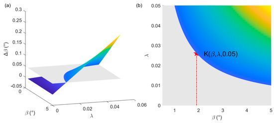 Relationship of Δβmr vs. β and λ. (a) Main view; (b) Projected view.