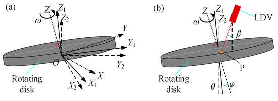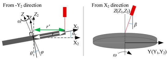 More specifically, under the motor’s drive, the rotating disk performs a counterclockwise circular motion at an angular velocity ω. Assuming that the distance from the laser spot P to the rotation center O of the rotating disk is r, then the tangential velocity VT at point P can be calculated as VT = ω · r. According to the triangular relationship in the figure, LDV picks up the projected velocity Vm of VT, and Vm = VT · sin(β). This expression shows that Vm is a function of ω, r, and β. When these three parameters are fixed, Vm is a fixed value. Based on this, the incident angle β of the LDV can be calculated by Equation (7).